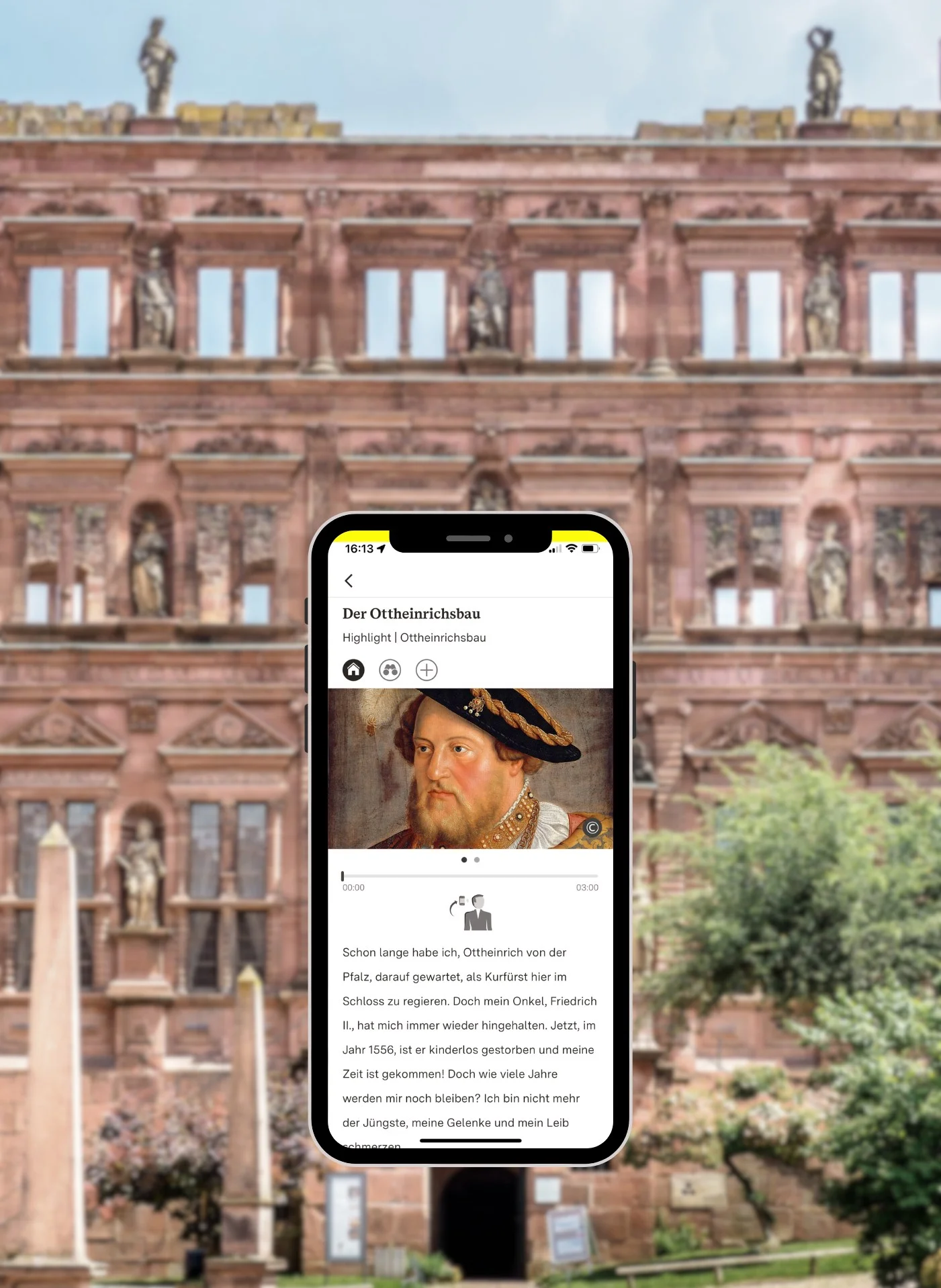 Die spannende Geschichte von Schloss Heidelberg können Sie mit „Monument BW“, der App fürs eigene Smartphone oder Tablet, vor Ort entdecken. Beeindruckende Bilder, Videos und Audios erwecken die Schlossruine zum Leben – ob mit der klassischen Erlebnistour oder der Thementour „Macht und Widerstand“.